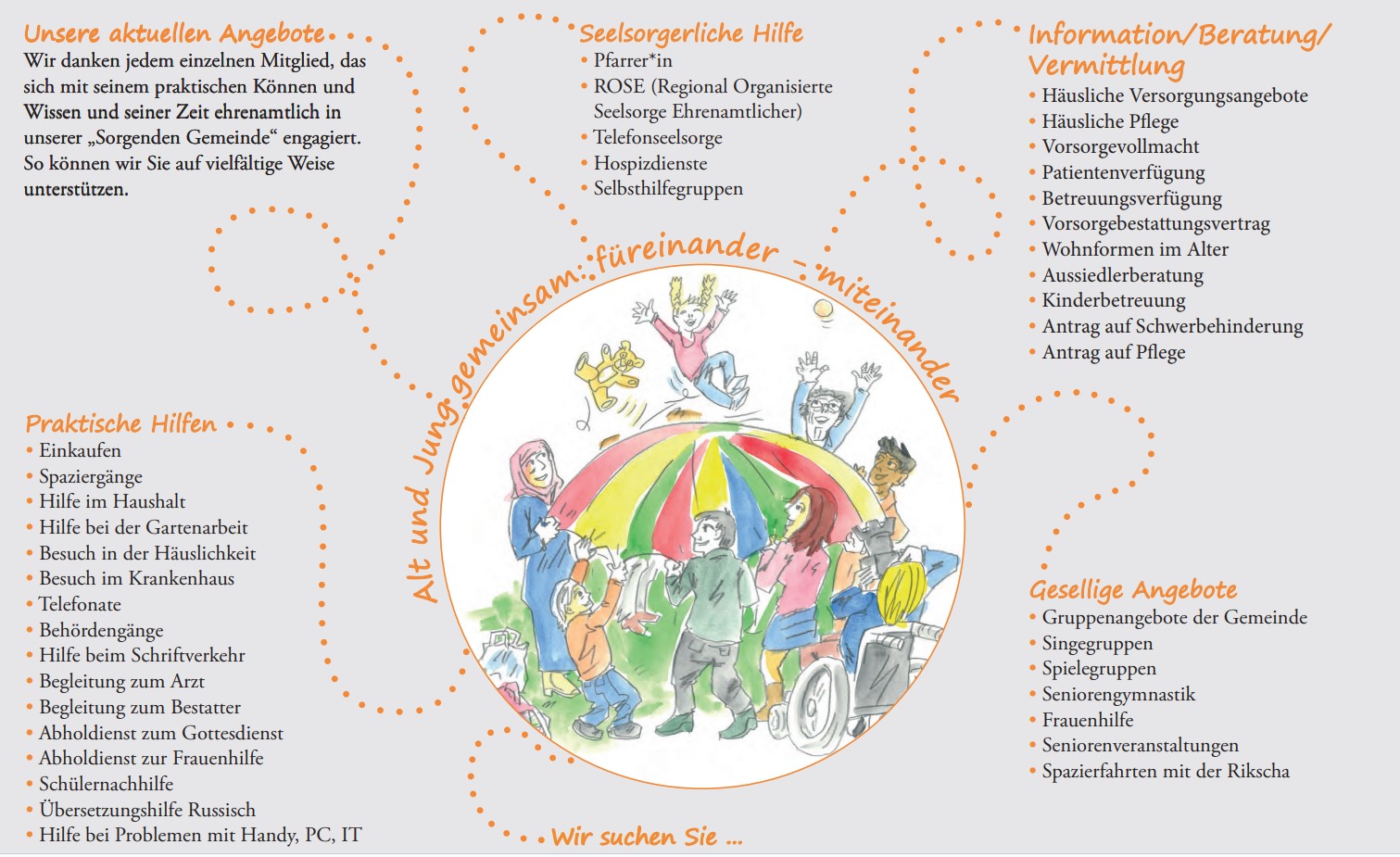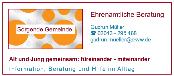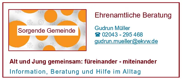 zu unseren Angeboten für sich, für Ihre Angehörigen, für Ihre Freunde oder könnten Sie sich vorstellen, mit einem eigenen Angebot Mitglied unserer Sorgenden Gemeinde zu werden, so nehmen Sie Kontakt mit uns auf.